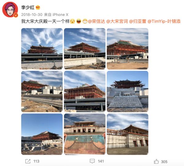 有了更为宽裕的资金,《大宋宫词》启动了仿宫殿建造,导演李少红先后在微博晒出建造中的大庆殿和大宋宣德门,拍摄地从原先的象山、横店等地拓展至开封市,经过192天的拍摄后,《大宋宫词》当年12月正式于开封杀青。
