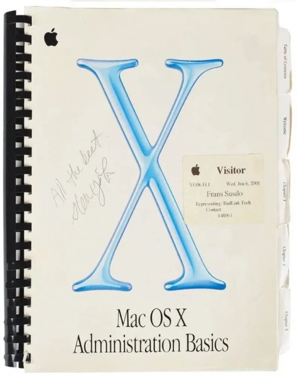 在RR Auction拍卖行上,苹果相关的物品拍卖得很火爆。乔布斯有一本在2001年签过名的Mac OS X技术手册《Mac OS X Administration Basics》,于2018年进行拍卖,起拍价为1000美元,但当时预计拍卖价高达25000美元。