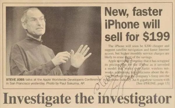 另一件拍卖品,是一张2008年的报纸,内容是乔布斯在iPhone 3G发布会(全球开发者大会WWDC 2008)上的演讲照片,以及iPhone 3G的相关新闻,上面有乔布斯和被称为iPod之父的 Tony Fadell的签名。该报纸起拍价将达到2500美元,其预计拍卖价格约为15000美元。