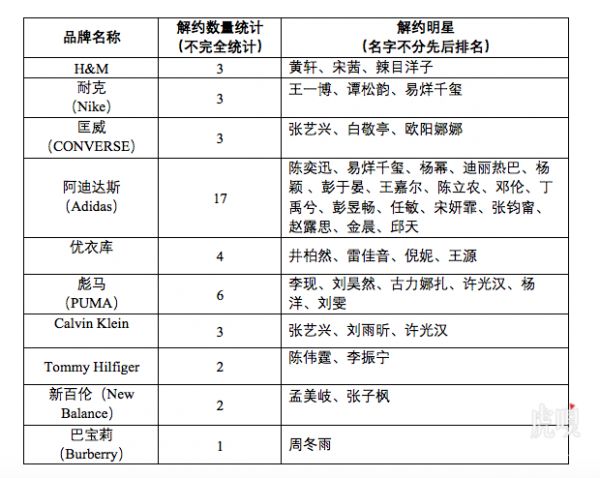 @虎嗅【艺人品牌解约潮:阿迪达斯解约人数已至17人,彪马6人】3月25日,继H&M等多家企业因抵制新疆棉而引发众怒后,越来越多的品牌代言人宣布终止合作。截至3月25日晚,已有超过40位明星发布与相关品牌终止合作公告,当天也被网友称为“内娱解约日”。