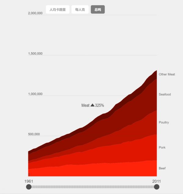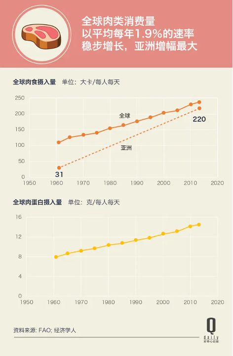 《国家地理》的统计进一步佐证了人类吃更多肉的趋势:1961 年至 2011 年,人们日常摄入的卡路里从 2194 大卡涨到 2870 大卡,其中从肉类获取的占比从 6 % 增加到 9 %。