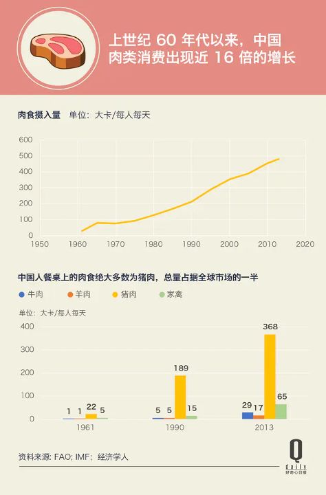 数据显示,全球肉类消费量,发展中国家和地区贡献了大部分的增长。中国在其中尤为突出。1960 年代以来,中国人均可支配收入从不到 500 美元提高到约 9000 美元。每天从肉食中获取的热量从 29 大卡跃升至 483 大卡、增长约 16 倍。年人均肉类消费量从 4 公斤涨到 62 公斤。是 50 年前的 13 倍。
