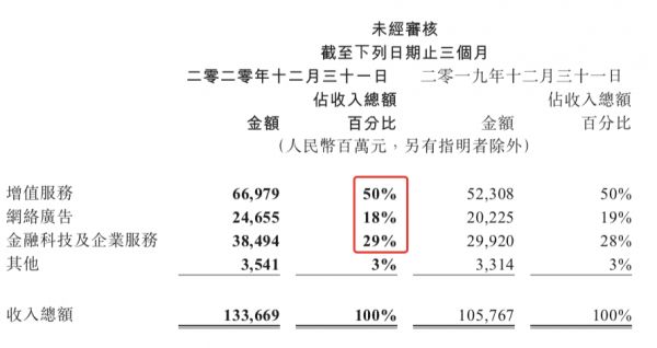 先从年度来看,财报显示,2020年增值服务、网络广告、金融科技及企业服务这三大业务的营收,分别实现了2642亿元、823亿元和1281亿元,在总营收占比为55%、17%和27%,与去年相比表现为“一升一降一持平”。但这样的年度对比可能还不明显,那我们再来看看季度的变化。从2020年的四个季度看,增值服务的营收占比呈连续下降趋势,已从去年一季度的58%下降到四季度的50%,而金融科技及企业服务的营收占比则持续上升,从25%上升到29%。