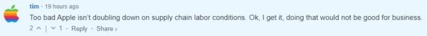 评论2:可惜的是,苹果没有加倍改善供应链的劳动力状况。好吧,我明白了,因为那样做对生意没好处。