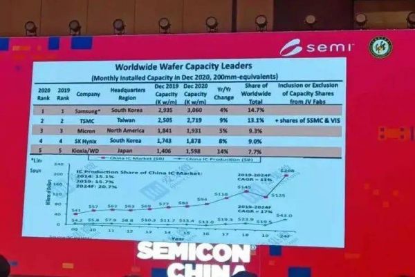 在SEMICON China 2021中国半导体大会上,中国工程院院士吴汉明援引IC insights数据表示,中国半导体行业丝毫没有过热现象,反之,产能依然大大不足,缺口很大,“当前我国芯片制造产能发展严重滞后于需求,供给能力和需求的差距越来越大,按照目前的速度发展,再过几年中国产能和需求的差距至少相当于8个中芯国际现在的产能,因此必须加速扩产”。