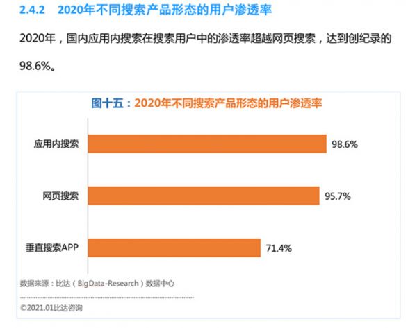 比达咨询发布的《国内搜索引擎产品市场发展报告2020》数据显示,2020年,国内应用内搜索在搜索用户中的渗透率超越网页搜索,达到创纪录的98.6%,网页搜索为95.7%。此外,浏览器和搜索引擎App已不再是唯一搜索渠道,购物类(49%)、地图类(48%)、视频音乐类(45%)、微信、新闻类、垂直社交类等App也占据了不小的份额。