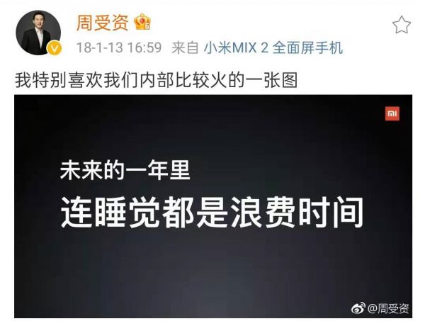 2015年离开DST加入小米时,他选择为这家年轻的中国企业付出精力和时间。在小米上市的前一年,他曾发微博称,“我特别喜欢我们内部比较火的一张图”,这张图片中写道,“未来的一年里,连睡觉都是浪费时间”。