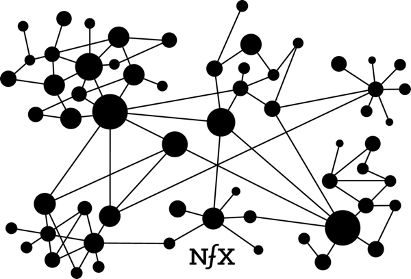 著名的梅特卡夫定律告诉我们,网络的价值与连接用户数的平方(N^2)成正比关系,每增加一个节点都让网络价值快速增长。因为真实世界存在的网络并不是一个规则的结构,而是像下图一样规模不一,呈群落状的结构,比如家庭、学校、共同兴趣的圈子是相对紧密的结构,这些小圈子是由一些联系员、内行、推销员等个别人物与更多人联系,一旦这类小圈子的用户达到一定规模,就会被个别人物引爆流行。