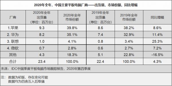 国内市场,2020年Q4,平板出货量为610万台,同比增长5.6%;2020全面,总出货量达到了2340万台,同比增长4.3%。