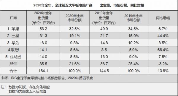根据IDC公布的数据,2020年Q4,全球平板出货量达到了5220万台,同比增长19.5%;2020全年,平板电脑的全球出货量为1.641亿台,同比增长了13.6%。
