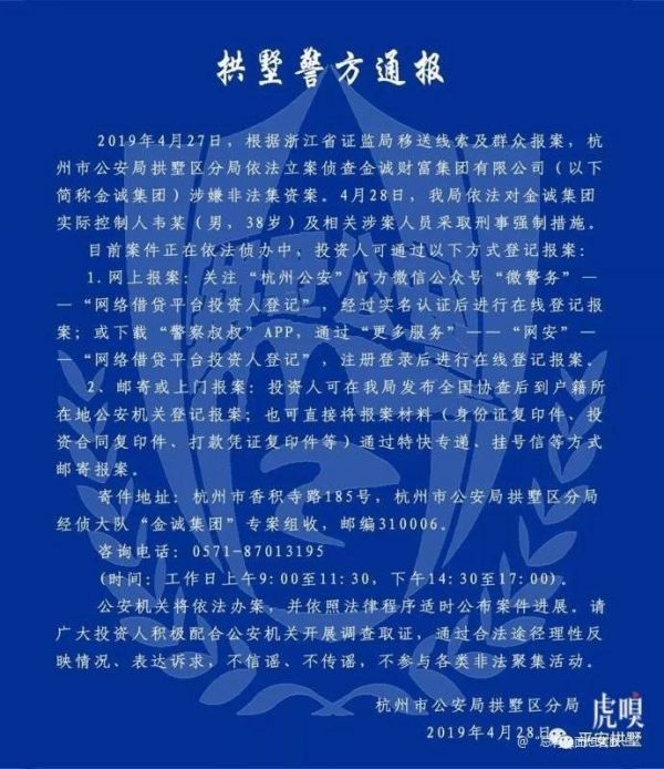 @界面【涉嫌非法集资,金诚集团实控人被采取刑事强制措施】拱墅警方通报:4月27日,根据浙江省证监局移送线索及群众报案,杭州公安局拱墅区分局依法立案侦查金诚财富集团有限公司涉嫌非法集资案。4月28日,杭州公安局拱墅区分局依法对金诚集团实际控制人韦某(男,38岁)及相关涉案人员采取刑事强制措施。