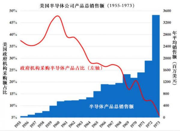 然而,到了20世纪60年代末,该行业发展得如此之快,以至于政府采购以及政府通过“第二来源”合同等方式实行准监管的能力,都变得相对不再重要。虽然半导体行业的存在是基于20世纪40年代末的军事采购,但到了20世纪60年代末,军事采购在市场中所占的份额已经不到原来的四分之一。