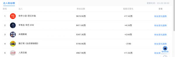 截至3月28日20点,快手的达人粉丝榜上,总粉丝第一名,是快手官方直播间“快手小店”,辛巴位列第二位,但是个体主播的第一位。复播一夜之后,辛巴的粉丝涨了4.24万。