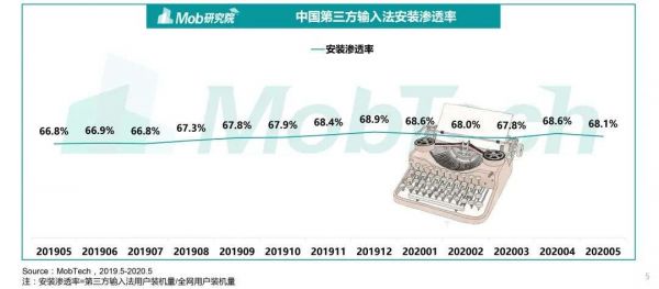 根据Mob研究院公布的数据信息,全网有接近70%的移动终端设备下载了第三方输入法软件,活跃用户数量也逼近7亿,整体呈现逐年增长的趋势。