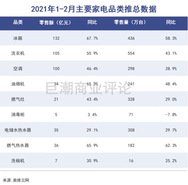 2020年行业萎缩,受疫情因素的影响,积累的需求将很有可能在2021年释放出来。从2021年1-2月家电的销售数据来看,同比去年疫情期间,都有大幅度的提升。