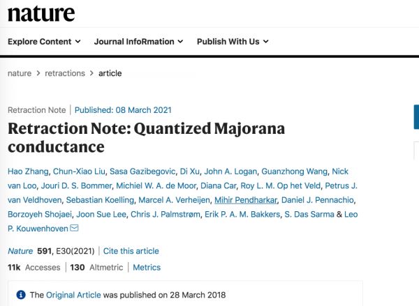 “很明显,他们基于这一数据做出的结果也不可信,”Frolov说。Frolov和Mourik因此致信论文作者和《自然》杂志,也正是从这时起,这一研究被质疑,并最终在2021年3月8日被正式撤回。
