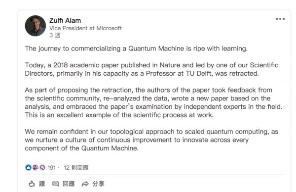 在LinkedIn上的声明中,微软Quantum副总裁Zulfi Alam写道:“我们对缩放量子计算的拓扑方法仍然充满信心。”