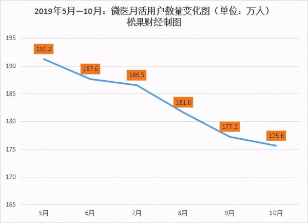 反观微医,其业务模式从单一的挂号业务转型至医疗服务、健康维护服务及医药电子商务等多业务协作模式下,APP内月活跃用户数却一度下滑。易观统计,2019年5至10月,微医APP月活跃用户数从191.2万一路下滑至175.6万,全网规模排名也从731名到876名。