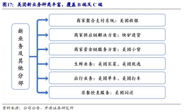 目前,美团的新业务及其他单元的收入来源主要包括 6 项, toB 及 toC 业务分列三项。当下,美团致力于细化服务项目、深化服务程度,实现 B 端服务链条、C 端用户平台及配送网络的的多效协同。
