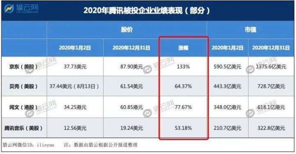 2020年,腾讯系中的美团股价累计涨幅为189.1%,拼多多累计涨幅为369.8%,京东累计涨幅为149.5%,哔哩哔哩累计涨幅为360.37%.......