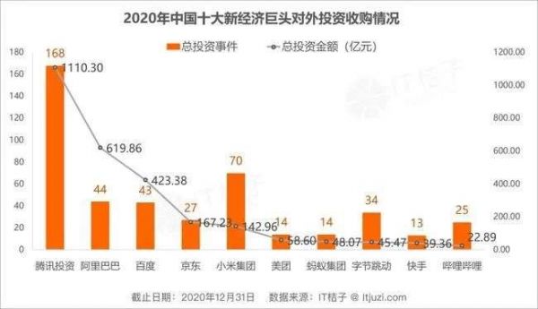 数据显示,腾讯2020年的对外投资约为631亿元,约占全年营收的13%。另外,据IT桔子统计,2020年度腾讯“投资+并购”的国内外企业达到168家,同比增加37%。