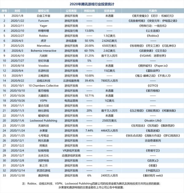 其中在游戏领域的投资最为夸张,数据显示,腾讯在2020年投资了33家游戏公司,而在2019年,腾讯仅投资了9家游戏公司。今年,腾讯更是加快了投资并购的脚步,截至目前腾讯已经公布投资了20多家游戏公司。