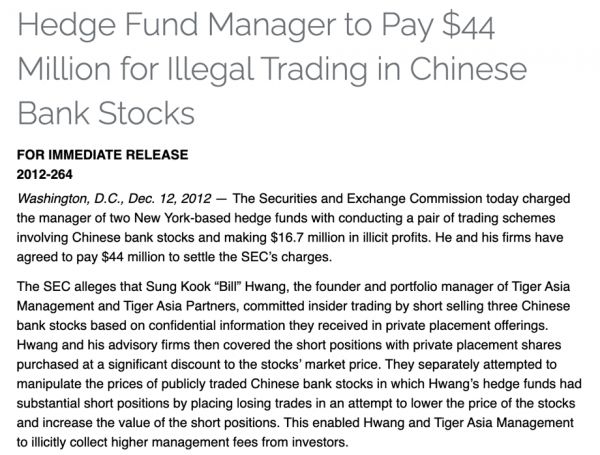2012年12月12日,美国证监会公告称,老虎亚洲的创始人比尔·黄承认内幕交易获利,开出罚单4400万美元。