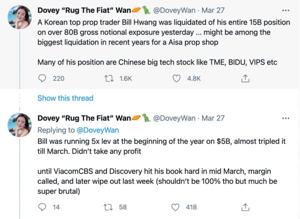 “随着维尔康姆和Discovery在三月中暴跌,触及平仓线,导致价值150亿美元的股票头寸被投行强平。他的持仓中包括多家中概热门股,如百度、唯品会、腾讯音乐等等。”万卉在社交媒体上表示。