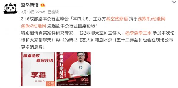 3月中旬,空然新语主办的剧本展在成都举办。所谓剧本展,实际上就是剧本杀展会。在展会中,剧本会被测试,一些测试后的反馈也会给到作者,以进行后续修改和完善。发行方与商家可以在现场进行交易。