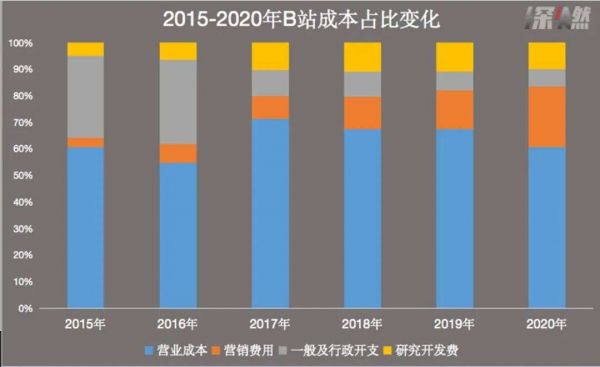 但高投入换高增长,投入的成本同样是显著的。B站2018年、2019年及2020年内容成本分别为5.43亿、10.02亿、18.75亿,占总成本的16.6%、17.9% 、20.5%,不论数额还是占比,都在逐年大幅递增。