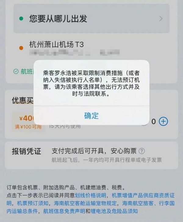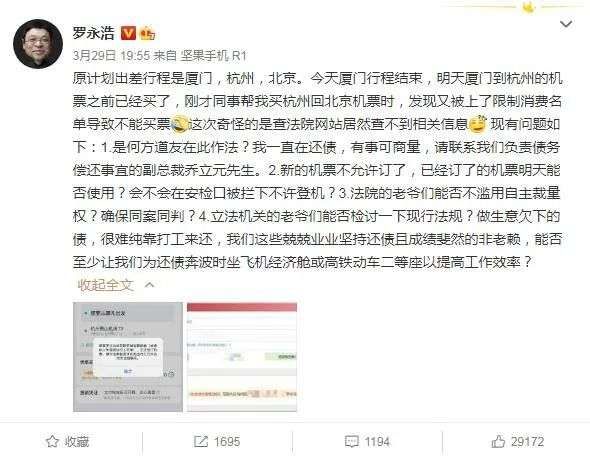 根据罗永浩微博,其原计划出差行程是厦门、杭州、北京。厦门行程结束后,厦门到杭州的机票已经买了,买杭州回北京机票时,发现又被上了限制消费名单,导致不能买票。他还表示,这次奇怪的是查法院网站居然查不到相关信息。