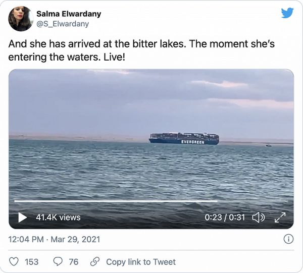 在苏伊士运河上“横”了六天的巨型货轮“长赐”号(Ever Given)周一终于脱浅并被拖至大苦湖。随后,这条全球最重要的海上大动脉恢复通航。当局称,预计运河将在数日内恢复至正常运转。