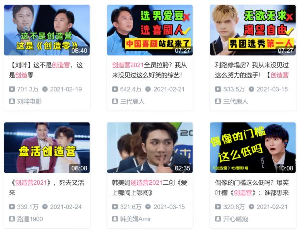 以今年两档热门偶像选秀节目为例,精彩纷呈的UGC内容已经成为了观众追综标配。除了开头所说的UP主@Elias轩邈,在B站搜索“创造营2021”,观看最高的均为粉丝娱乐向解说。时间回到今年2月,第一则高达百万次点击的吐槽视频,为节目带来了第一波热度,而后来糖果超甜组合、利路修等选手的出圈与之不无关联。