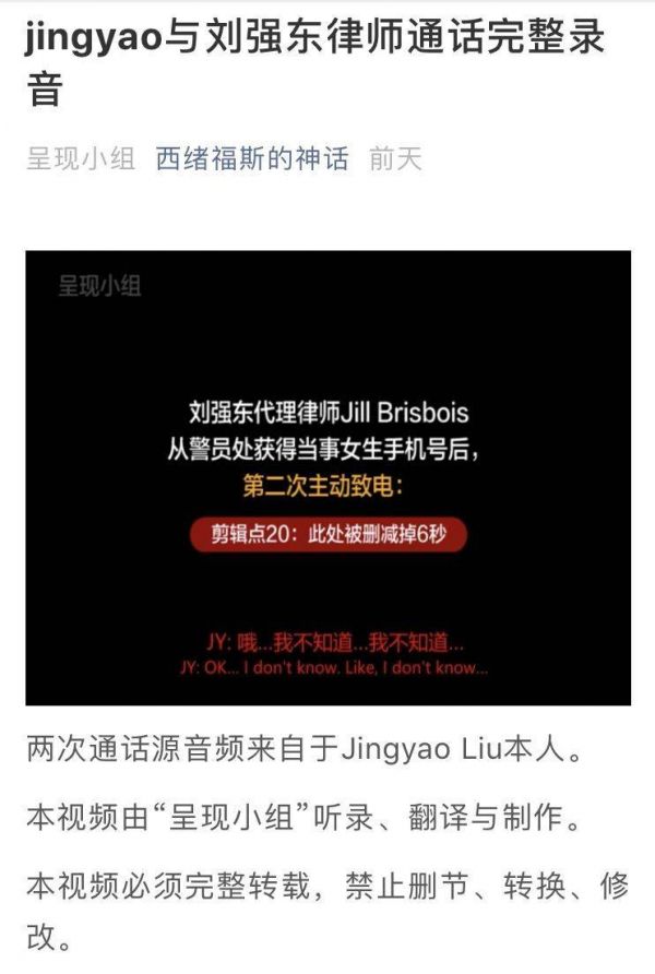 微信公众号“西绪福斯的神话”放出了刘强东代理律师和Jingyao对话的完整音频