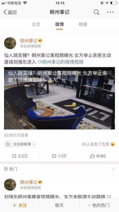 一条名为“刘强东明州案晚宴视频曝光,女方未醉酒主动跟随”,另一条名为“仙人跳实锤?明州案公寓视频曝光,女方举止亲密主动邀请刘强东进入”。