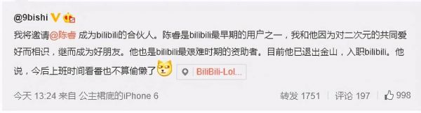 2014年11月29日,徐逸的一条微博在互联网圈“炸”开了,在这条微博里,他对外透露陈睿正式入职B站。众人的不理解在于,这一年,猎豹移动刚刚风光上市,而身为3号人物的陈睿却在此时选择退出,加入仅有30多人的B站。
