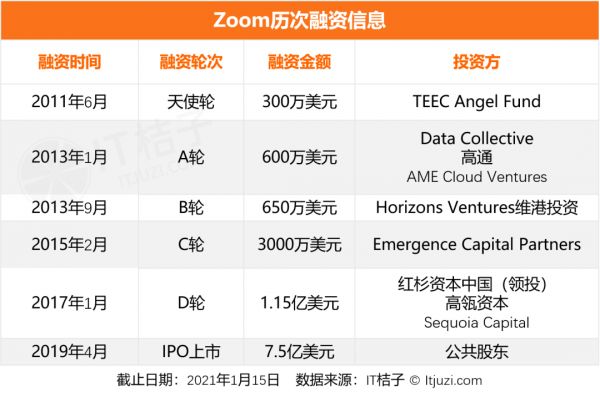 2011 年袁征离开思科,创办了在线云视频会议 SaaS 产品 Zoom——和他的前东家朱敏一样,袁征 40 多岁才开始创业,甚至创业方向也一样,但在模式上,一个做软件,一个做 SaaS。刚创业,Zoom 就拿到了 300 万美元的天使融资,此后 Zoom 基本保持每两年新融一轮的节奏,非常稳定,每一轮融资额也很合理——没有像国内在某一个「风口」期密集融资,且披露的融资额超高的情况。当然,这也与企业服务领域的行业特点相关。