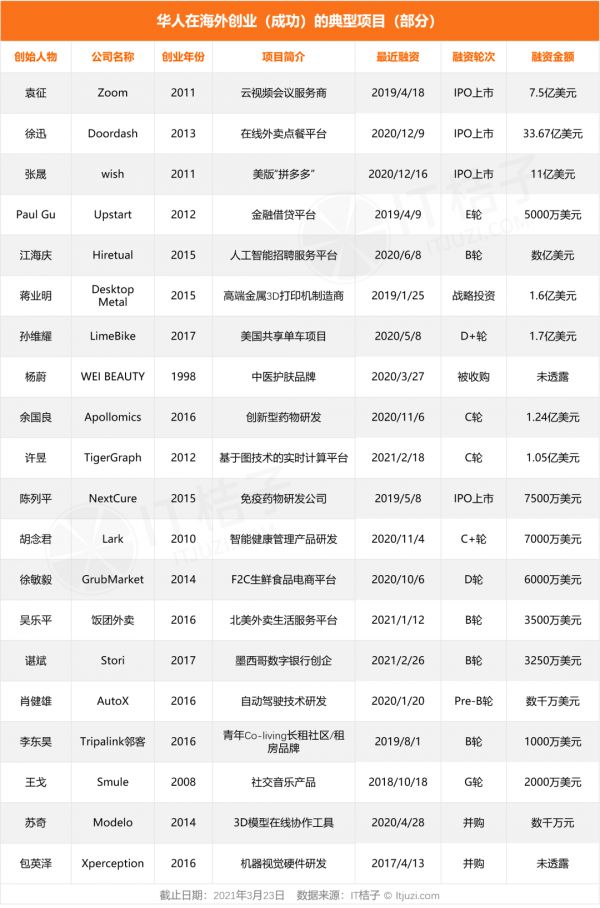 IT 桔子发现,以上华人海外创业的典型项目都是在发达的北美地区(美国占大多数),一是美国各种配套服务比较完善,创业起步快;二是对特定行业而言,比如企业服务,只有新经济创投发展成熟的美国市场才是适合孕育像 WebEx、Zoom 这类企业服务上市公司的土壤。