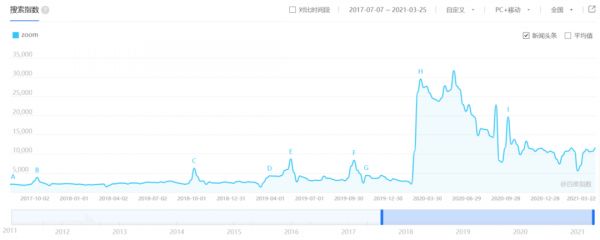 从 Zoom 最近 5 年的百度搜索指数可以看到非常明显的变化,Zoom 上市这个重大新闻基本没在国内溅起水花,只带来小范围影响;而 2020 年春节 Zoom 爆红,成为大众熟知的主流公司。