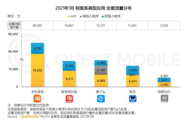 阿里系内部已经有产品从微信生态内薅到了流量。Questmobile报告显示,2021年1月,饿了么微信小程序用户量在去重总用户量中占比37.45%。倘若淘宝特价版小程序得以开通,淘宝特价版乃至淘系未来几个季度的用户增速便有了保障。