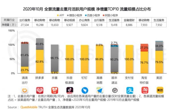 根据Questmobile报告,去年10月,拼多多月活用户中,微信小程序用户量在去重总用户量中占比为40.8%,京喜则更为夸张,微信小程序用户量在其去重总用户量中占比达到96.1%,显然,微信小程序已成为电商获客和维持粘性的重要渠道。