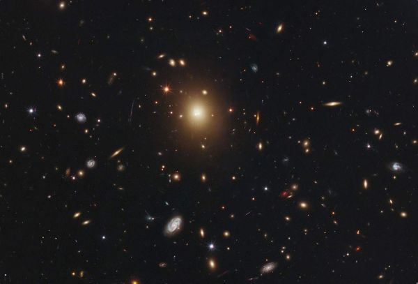 由于中心黑洞的质量通常与星系本身的质量一致,所以当十年前,太空望远镜科学研究所(Space Telescope Science Institute)的马克·波斯特曼(Marc Postman)用哈勃太空望远镜勘测星系团时,发现一个超巨型星系的中心没有黑洞的影子,这让人们感到非常惊讶。正常情况下,由于巨型黑洞的强大引力,将分散的恒星以及行星吸附成为一个个的星系。这就是为什么星系的中心会闪闪发光的原因。