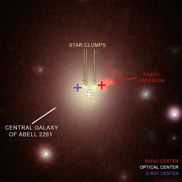 马克和劳尔认为,Abell 2261中曾经产生过黑洞合并。但是,星系团的中心并没有出现一个峰值,超大质量黑洞及其环绕左右的恒星仿佛凭空消失了。