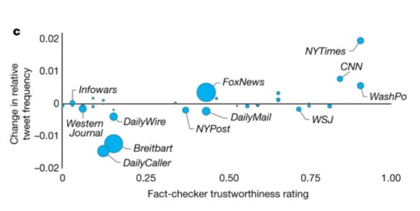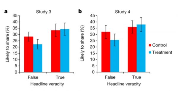 之后,研究者在推特上,针对5000名用户进行实验,要求他们在发送消息前,先判定消息的准确性,之后评价其在24小时内分享信息的模式和他们日常的模式有什么区别。结果表明,这些用户对主流媒体的转发频率上升,而转发来自虚假信息泛滥的社交媒体的信息的概率大大降低。