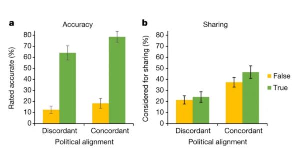 但有趣的现象是,一旦人们处于分享状态时,这些标题是否符合受试者的政治立场,对他们是否分享消息的决定影响更大——远大于消息准确性的影响。