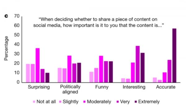 对2016年美国大选中推特上的大规模研究也发现了相同的趋势——当询问有哪些因素会影响分享的意图时,人们普遍指出信息的准确性十分重要,但事实却与之背道而驰。