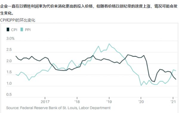 目前生产者价格指数(PPI)高于消费者价格指数(CPI),这是2019年7月以来第一次出现这种现象。笔者考察的数据是美国劳工部1月和2月公布的数据,虽然两个月还不会形成趋势,但这一现象反映出大量企业面临的定价压力越来越大,同时也表明至少就目前而言,企业正在吸收上升的成本,而不是将其转嫁给客户。