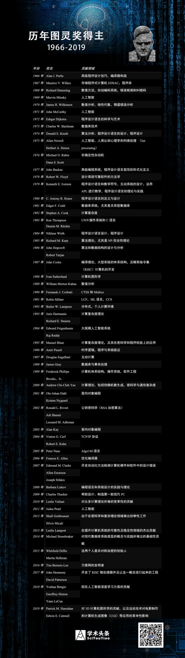 每一年的图灵奖一般在下一年的 3 月颁发,从 1966 年至 2019 年共有 73 名科学家获此殊荣。其中美国学者最多,此外还有英国、瑞士、荷兰、以色列等国少数学者。截至目前,获此殊荣的华人学者仅有 1 位,即 2000 年图灵奖得主姚期智(2005 年出任香港中文大学博文讲座教授,2011 年担任清华大学交叉信息研究院院长,2017 年转为中国科学院院士)。