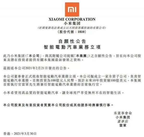 为了造车,小米首期将投资100亿元人民币,预计未来10年投资100亿美元,小米集团CEO雷军将兼任智能电动汽车业务的首席执行官。