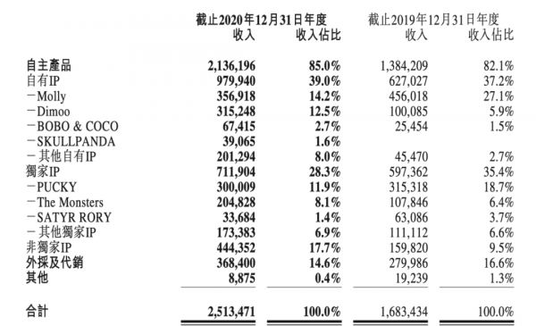 根据泡泡玛特的招股书显示,2020年上半年,盲盒产品收入占泡泡玛特期内总收入的84.2%。包括自有IP、独家IP、非独家IP在内,共占2020年总收入的85%。